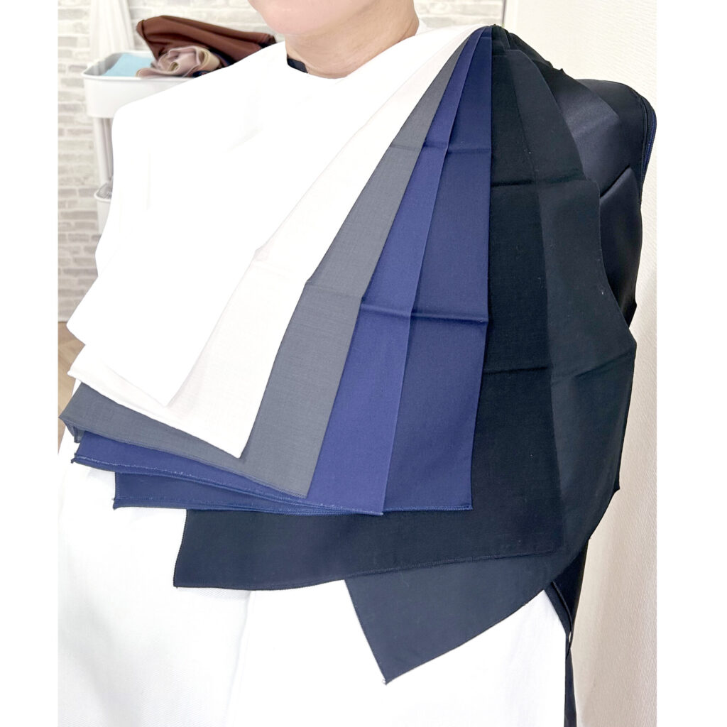 基本的には高明度なパステルは顔色がぼんやりして見えるのですが、水色とラベンダーのみ「黒や紺と組み合わせる(コントラストを付ける)」ことでお似合いになりましたね。