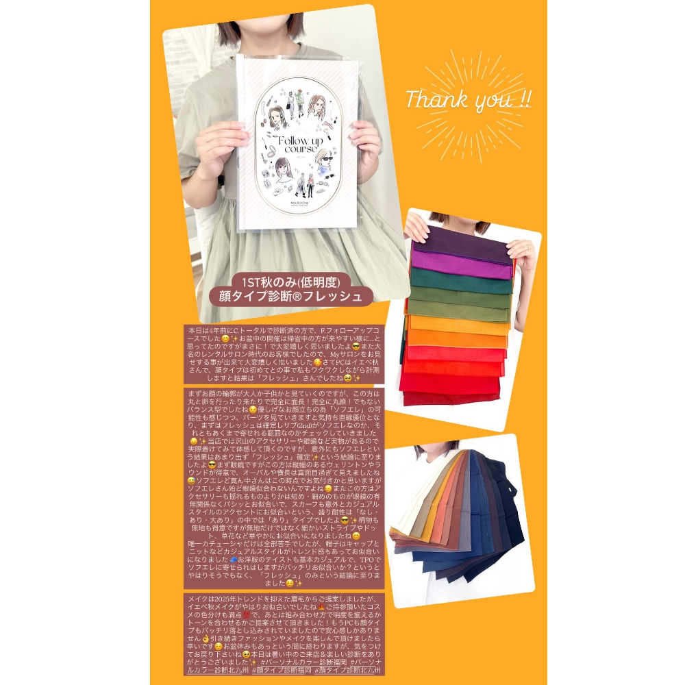 (当店では二人目のフレッシュさんでしたが、意外にもブルべ冬や今回のイエベ秋さんのようにPCは強めな方が続いておりますね)