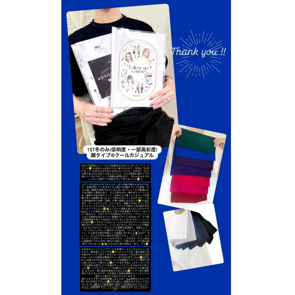 ≪顔タイプ診断®「クールカジュアル」/PC:1st冬のみ(低明度・一部高彩度)/当サロン初のクールカジュアルさんで、直線かつ大人顔方向(クール・エレガント)へも寄せる事が可能なタイプでした✨≫