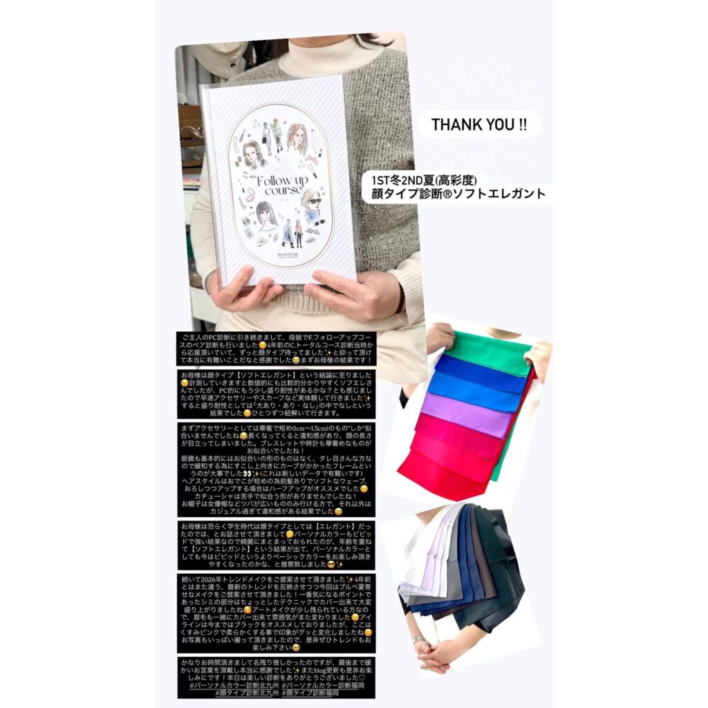 パーソナルカラーもビビッドで強い結果なので綺麗にまとまっておられたのが、年齢を重ねて【ソフトエレガント】という結果が出て、パーソナルカラーとしても今はビビッドというよりベーシックカラーをお楽しみ頂きやすくなったのかな、と推察致しました✨